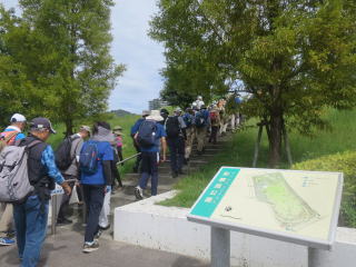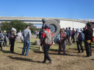 ゴールデンウイーク後半初日の3日。 同じ日にJRふれあいハイキングは他に6コースがあり、心配しました。ですが、多くの方の参加があり、用意した地図が足らなくなり、ご迷惑をおかけしました。 尼崎駅北広場を出発し、猪名川公園を目指しました。 西川東公園でトイレ休憩と列詰めをし、灯台としての役割があった神崎金比羅さんの石灯籠を見て小田東公園へ。 ここでアンカー待ちをし、猪名川沿いの土手を歩きました。 猪名川公園から田能遺跡に向かう土手道から園田競馬場を覗くことが出来ました。 田能遺跡では復元された住居や高床倉庫を見学しました。資料館では田能遺跡の「御朱印」を配布していました。 |
